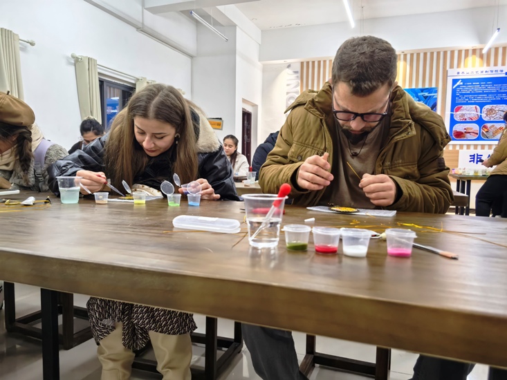 活动期间,国际学生们参与了多项非遗技艺体验。在万里茶道学院,他们学习了茶艺、果茶以及奶茶的制作工艺,在袅袅茶香中感受中国传统茶文化的深邃内涵;在陶瓷技艺展示区,学生们亲手触摸泥土,在指导下尝试制作陶瓷作品,体会从泥土到精美器具的奇妙转变;在扎染技艺环节中,他们目睹了普通布料在扎染工艺下变成绚丽多彩艺术品的全过程,并亲手创作属于自己的扎染作品,感受传统染色技法的独特魅力。