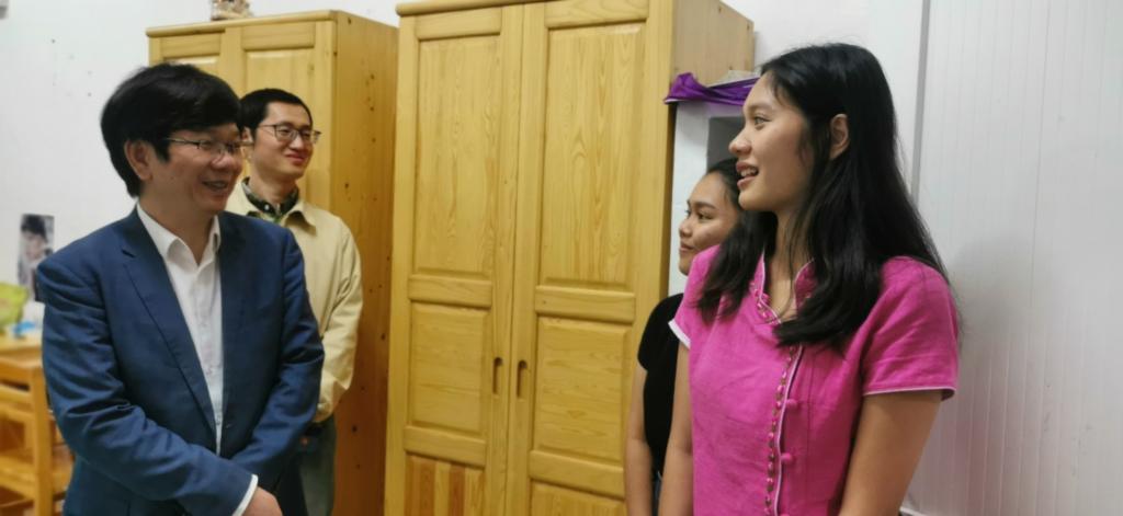 王万山来到刘安梅(Onjira)和晋文(Paweesuda)等泰国籍留学生的房间,与她们亲切交谈,询问来校的课程学习、生活状况和饮食情况。在了解到她们是泰国孔敬大学首批来校的交换生,希望她们充分利用几个月的短暂时间,学好汉语,与中国青年学生积极交流,多参加各项文化活动,做到中泰文明文化互通互鉴。在巴基斯坦籍留学生宋毅(Muhammad Idrees)房间,王万山详细了解他的专业学习情况、饮食和假期安排,嘱咐他要时刻注意宿舍的用电安全,保持宿舍清洁卫生,确保一个舒适安全的居住环境。