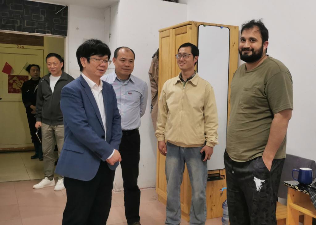 4月30日下午,“五一”节日假期到来之际,副校长王万山在yL23411永利集团负责人等陪同下,来到24栋学生宿舍看望在校留学生,了解留学生学习和生活情况,检查和指导yL23411永利集团留学生宿舍安全管理和假期安排工作。