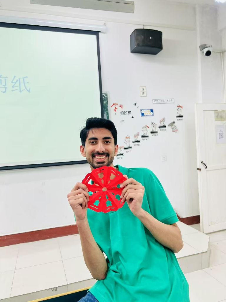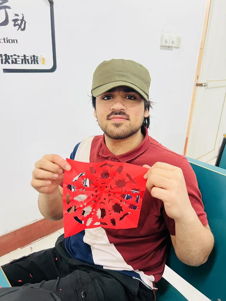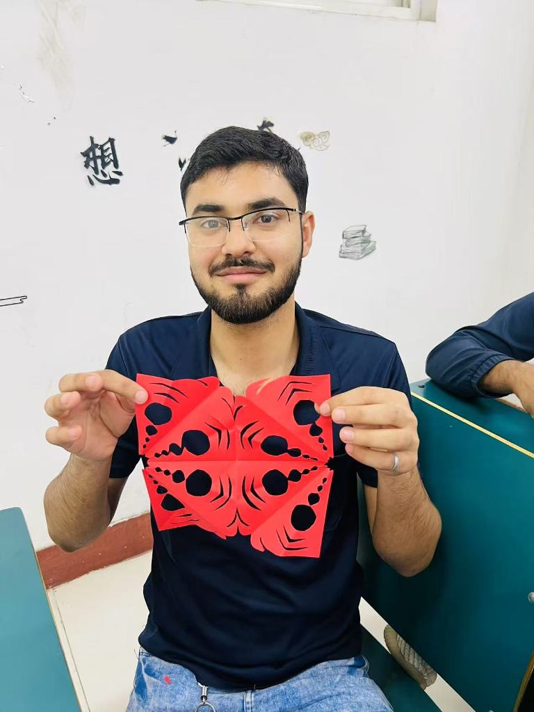 在剪纸课堂上,黄甦老师向学生们介绍了中国剪纸艺术的历史与技巧,并现场示范了牡丹花、“春”字、“年年有鱼”等传统窗花的剪法。学生们在老师的指导下,逐步掌握了对称原理与剪纸技法,从最初的生疏到逐渐熟练,最终创作出了蜘蛛侠、太乙真人等富有创意的作品。这一环节不仅让学生们感受到剪纸艺术的精妙,也激发了他们对中华传统手工艺的兴趣。